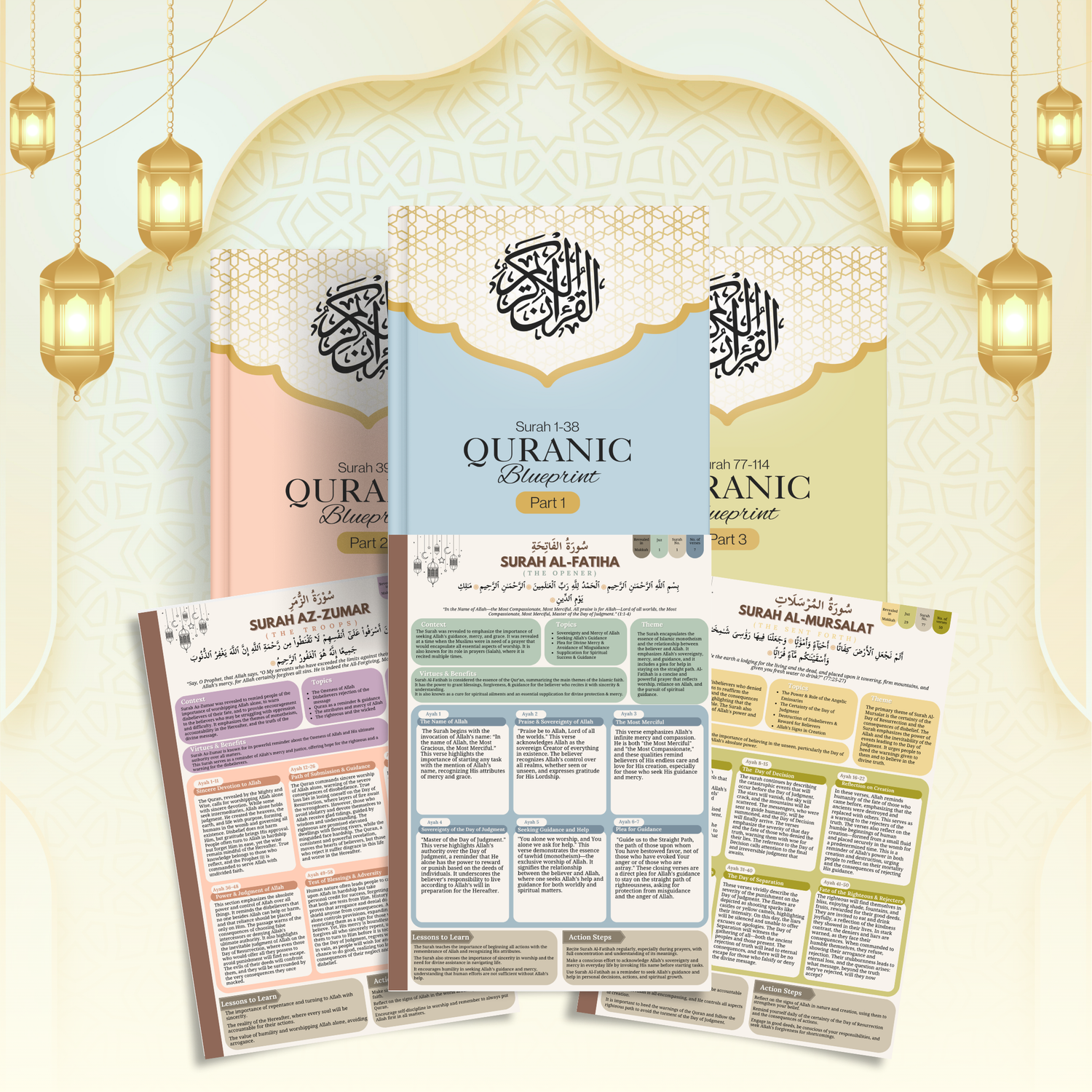 The Quranic Blueprint is a 3-part series designed to make the understanding of the Quran simple and accessible. It offers one-page summaries of each Surah, providing key lessons, context, and themes for easy learning and reflection.