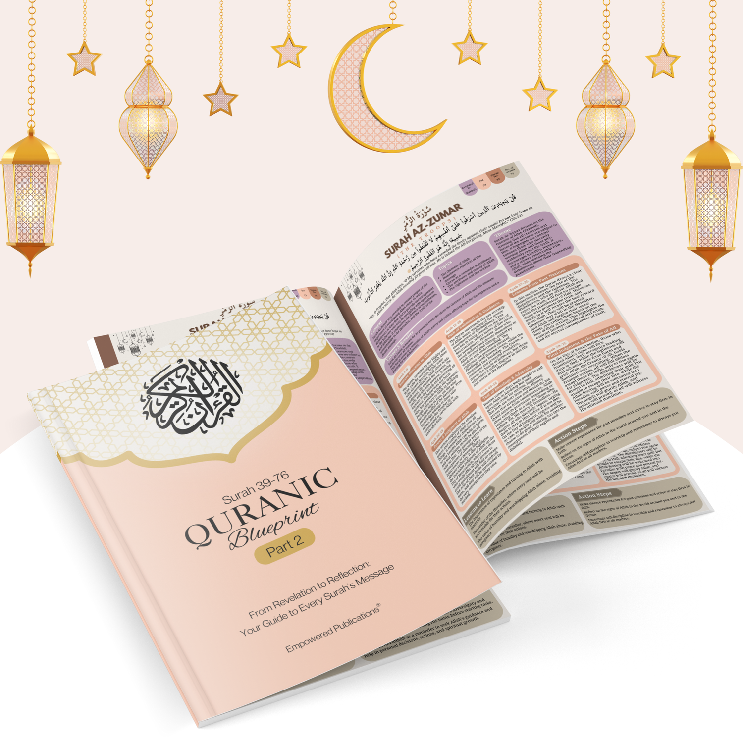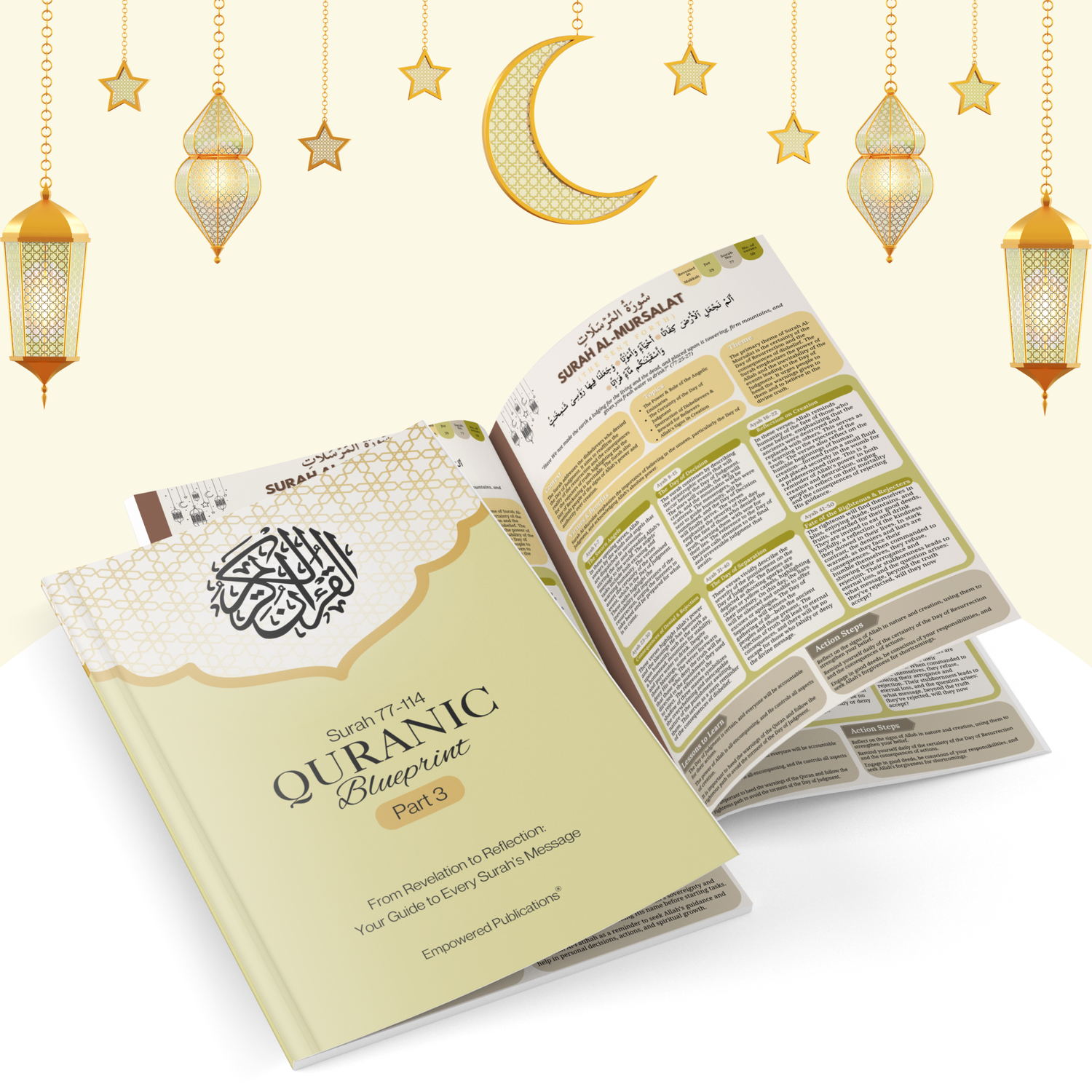 Each Surah is summarized on a single page with clear context, key themes, and actionable lessons.